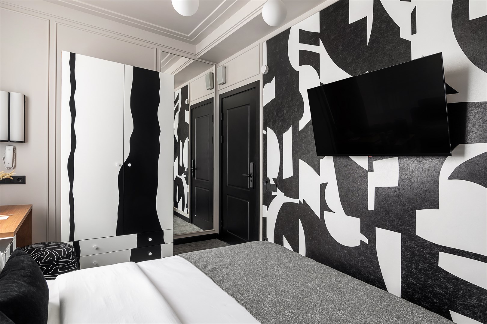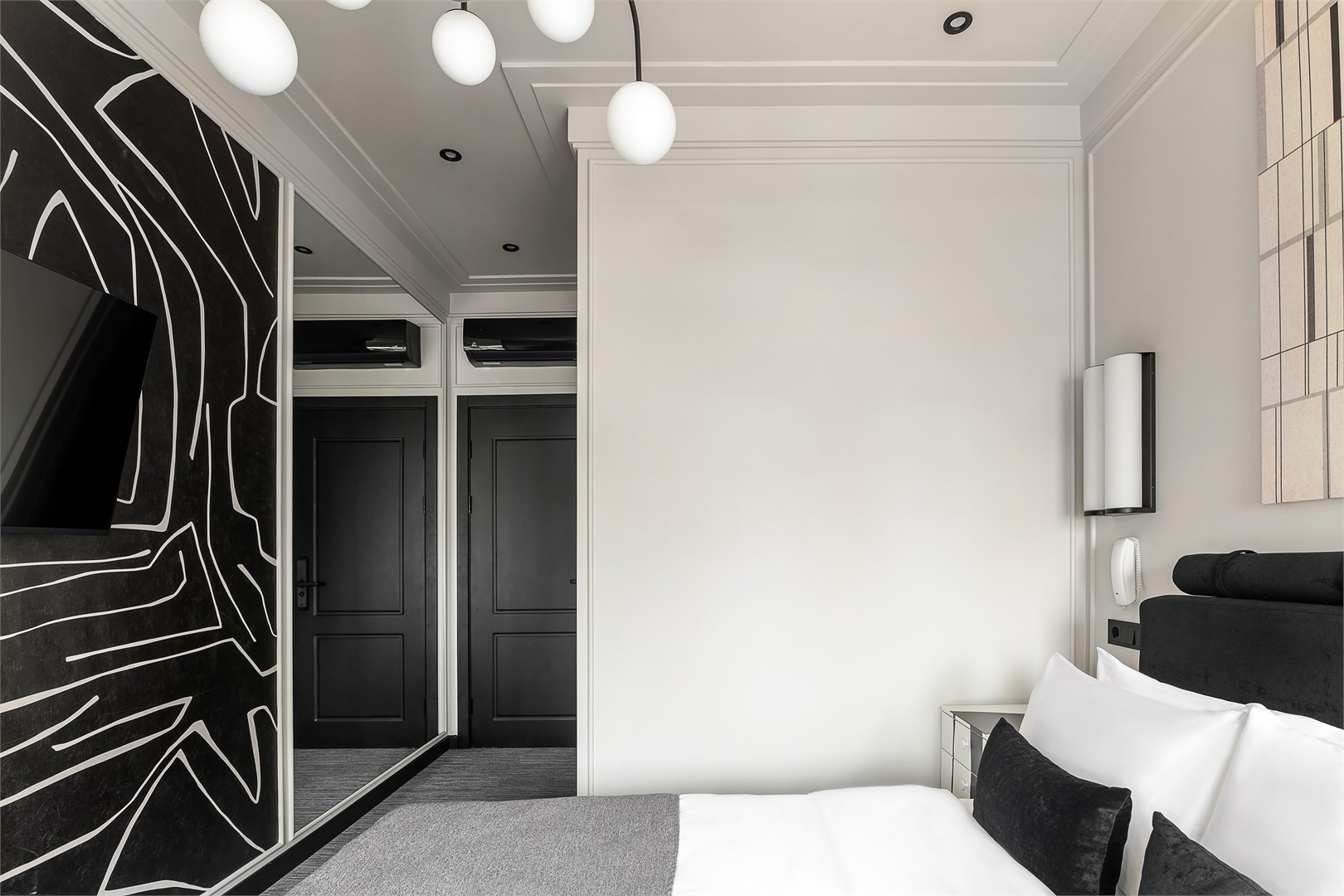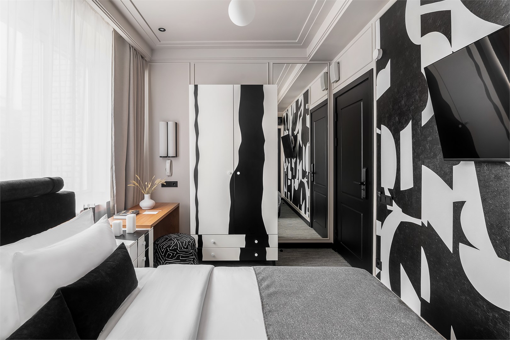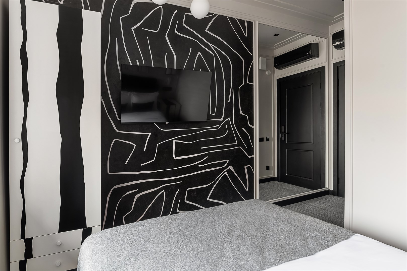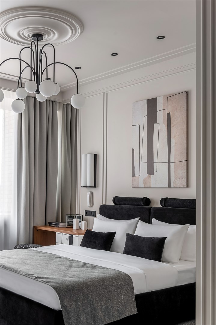 - Мебель: зеркало, кровать двуспальная, прикроватные тумбочки, стол, стул, шкаф