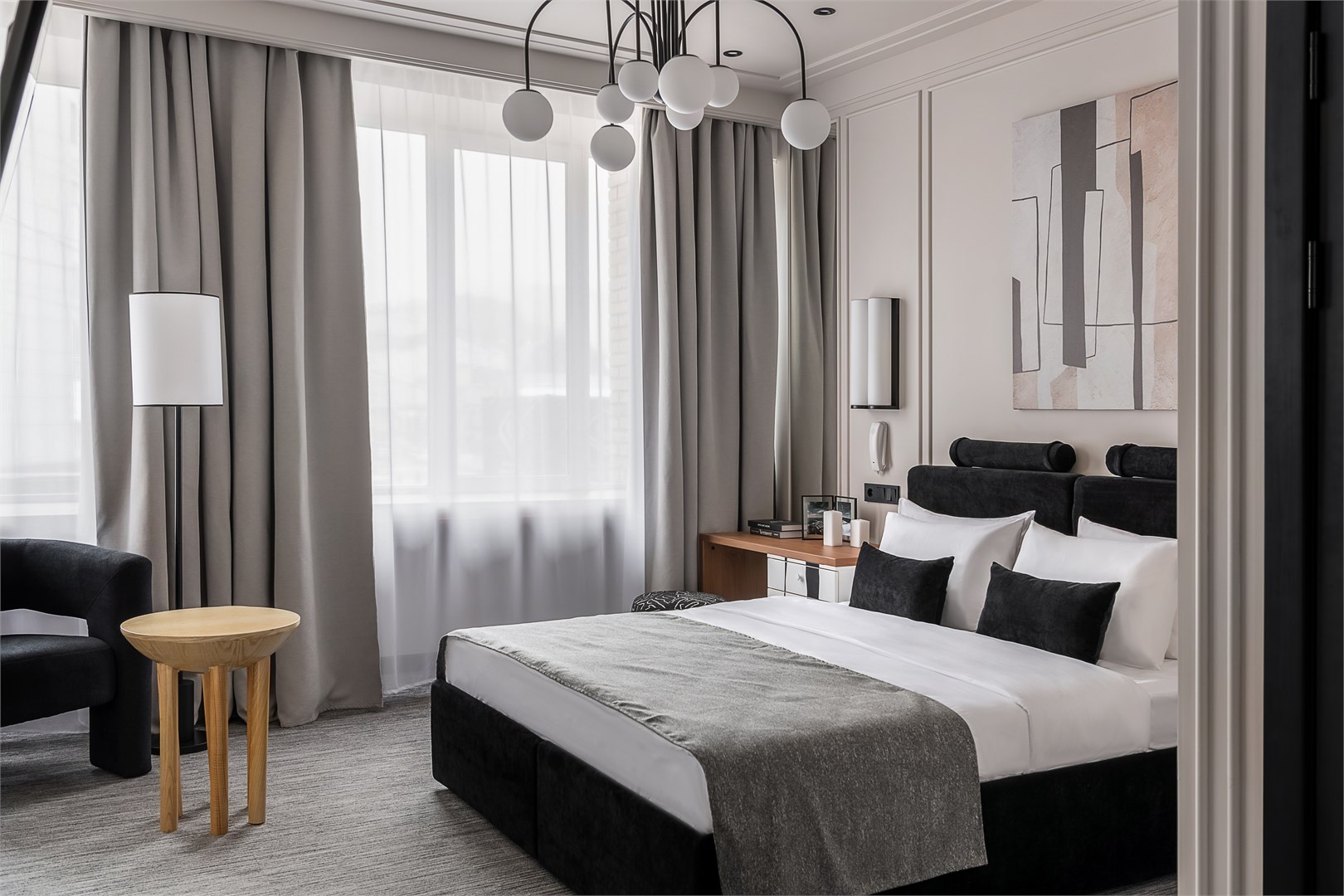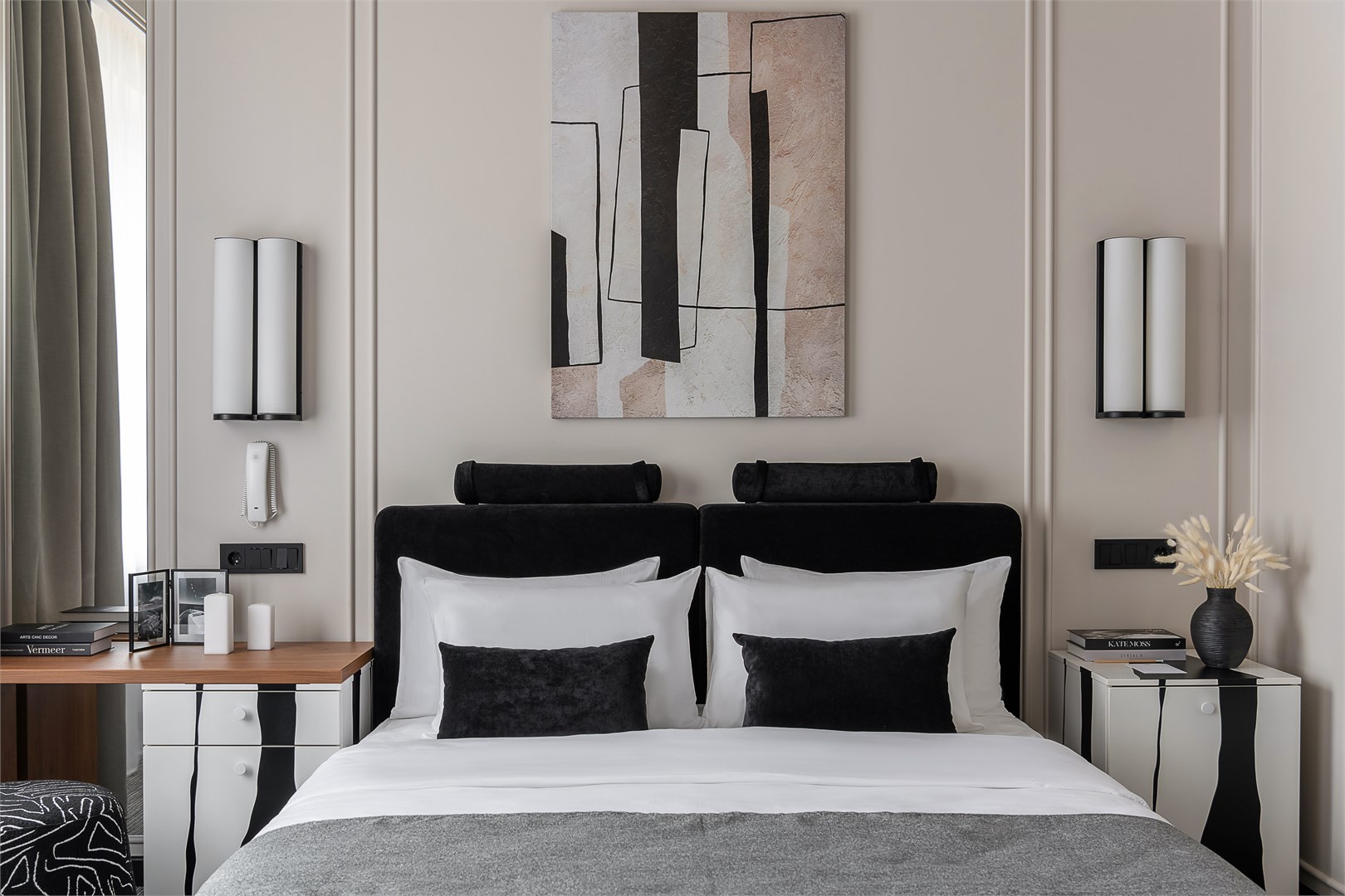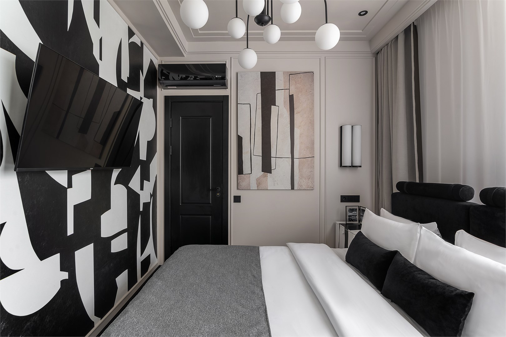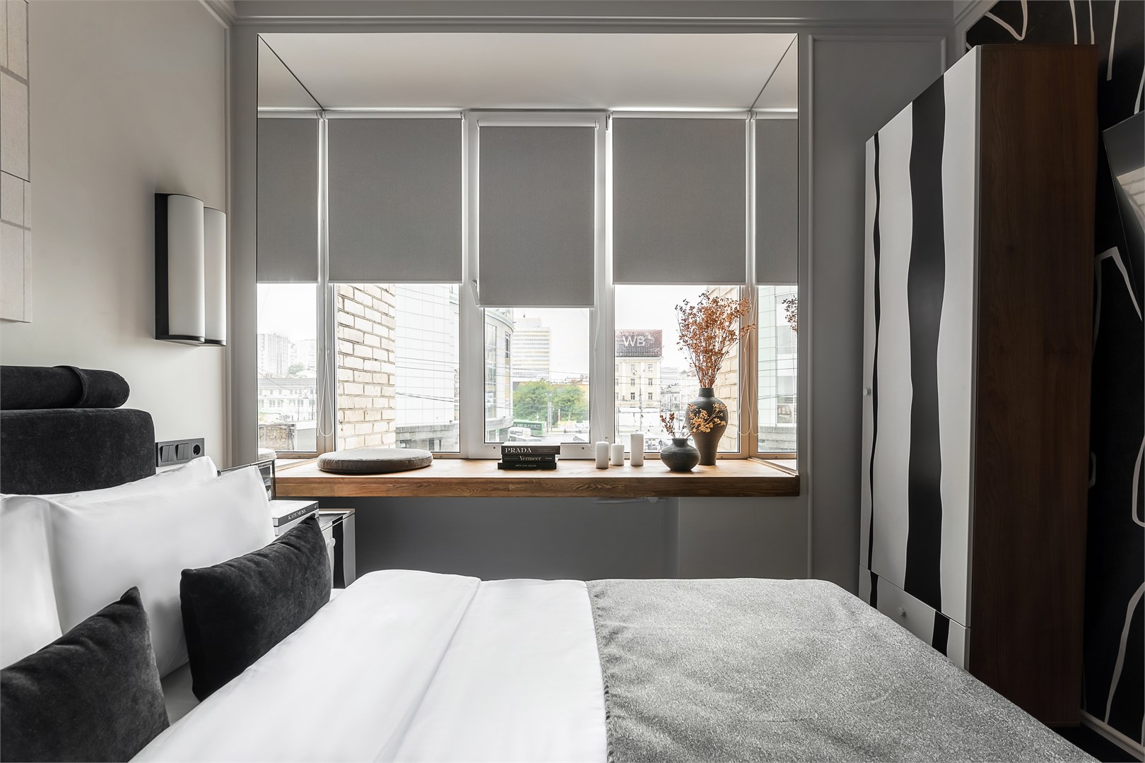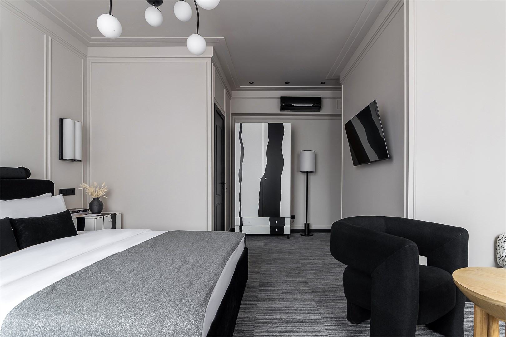 - Мебель: зеркало, кровать двуспальная, прикроватные тумбочки, стол, стул, шкаф