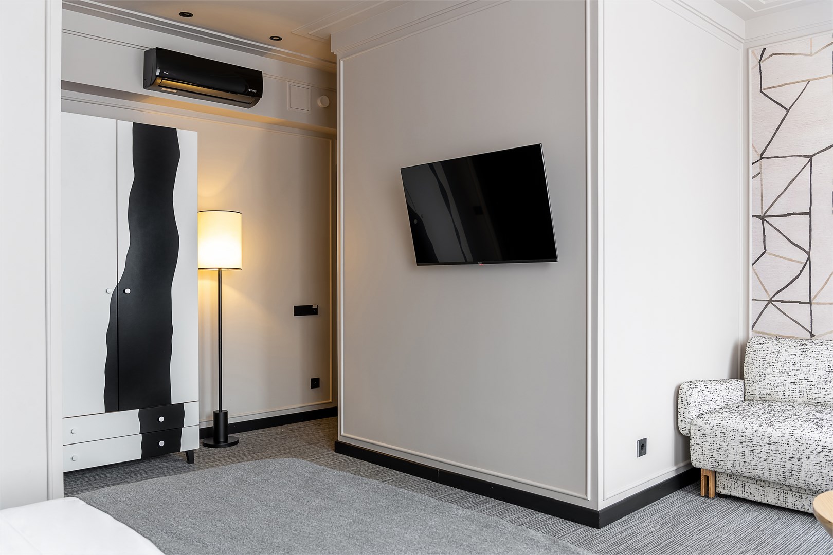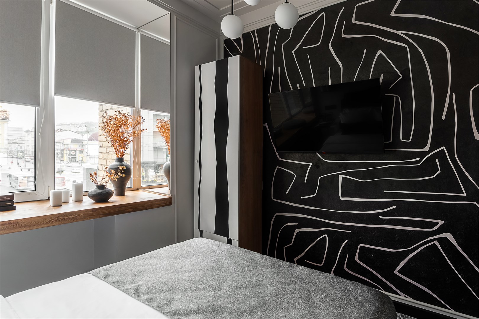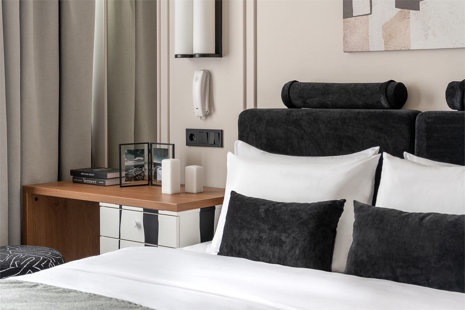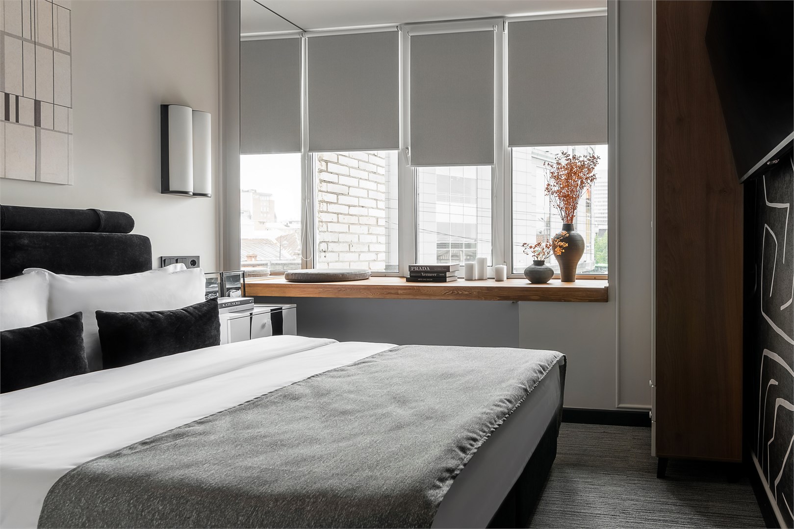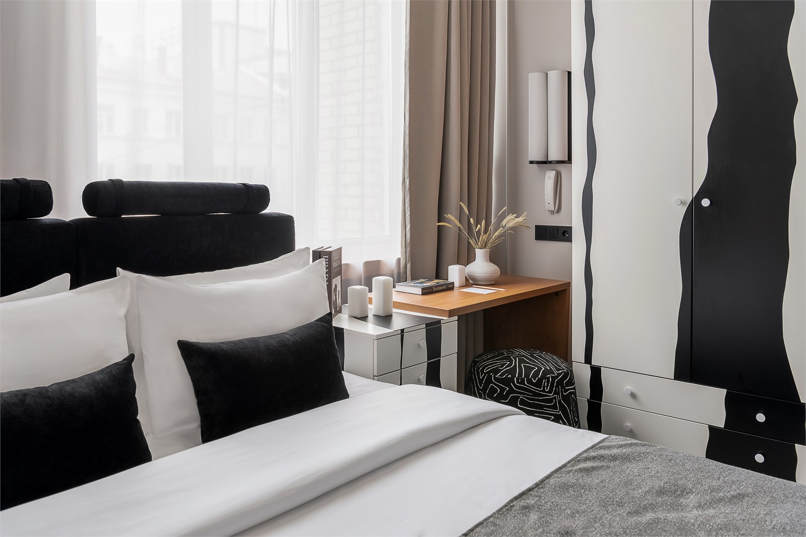 - Мебель: зеркало, кровать двуспальная, прикроватные тумбочки, стол, стул, шкаф