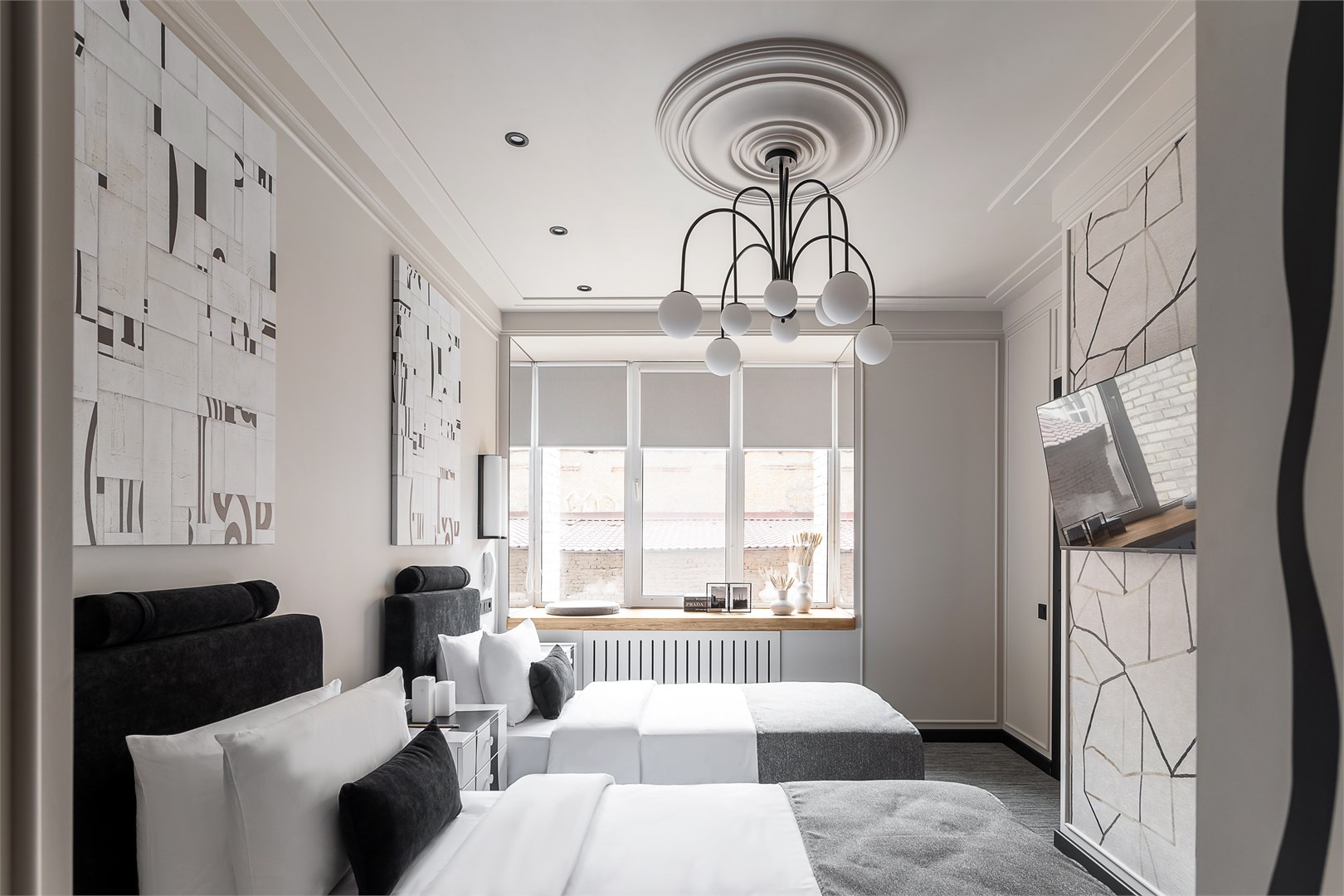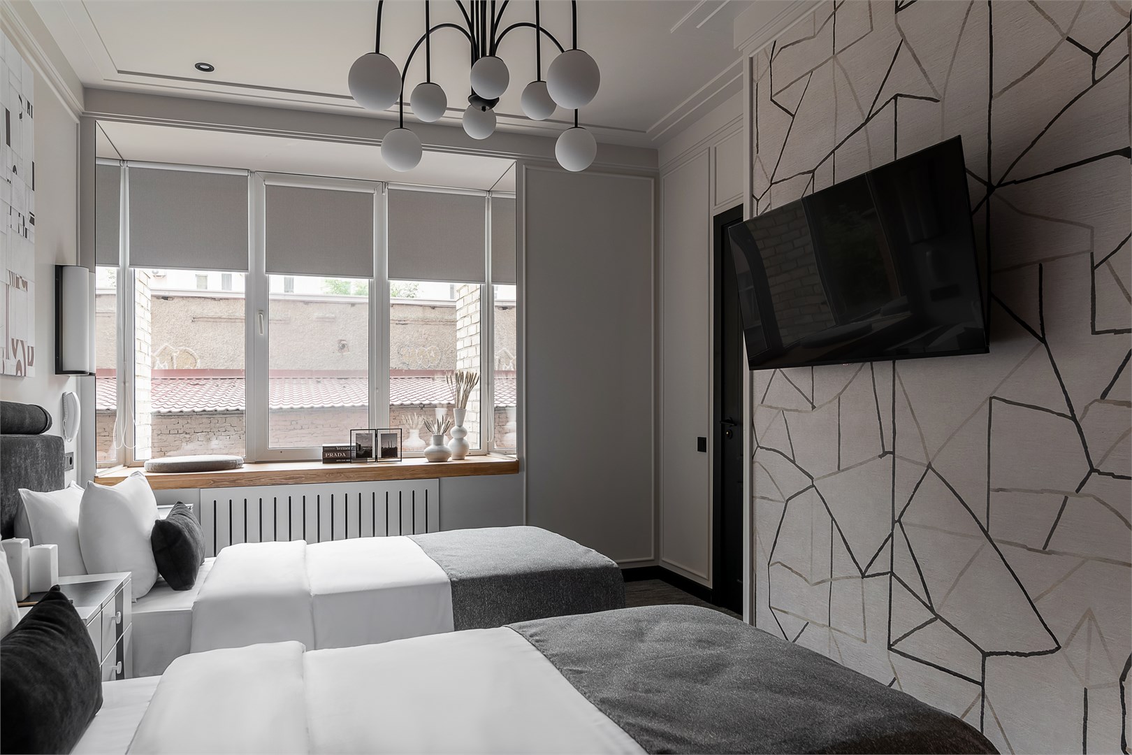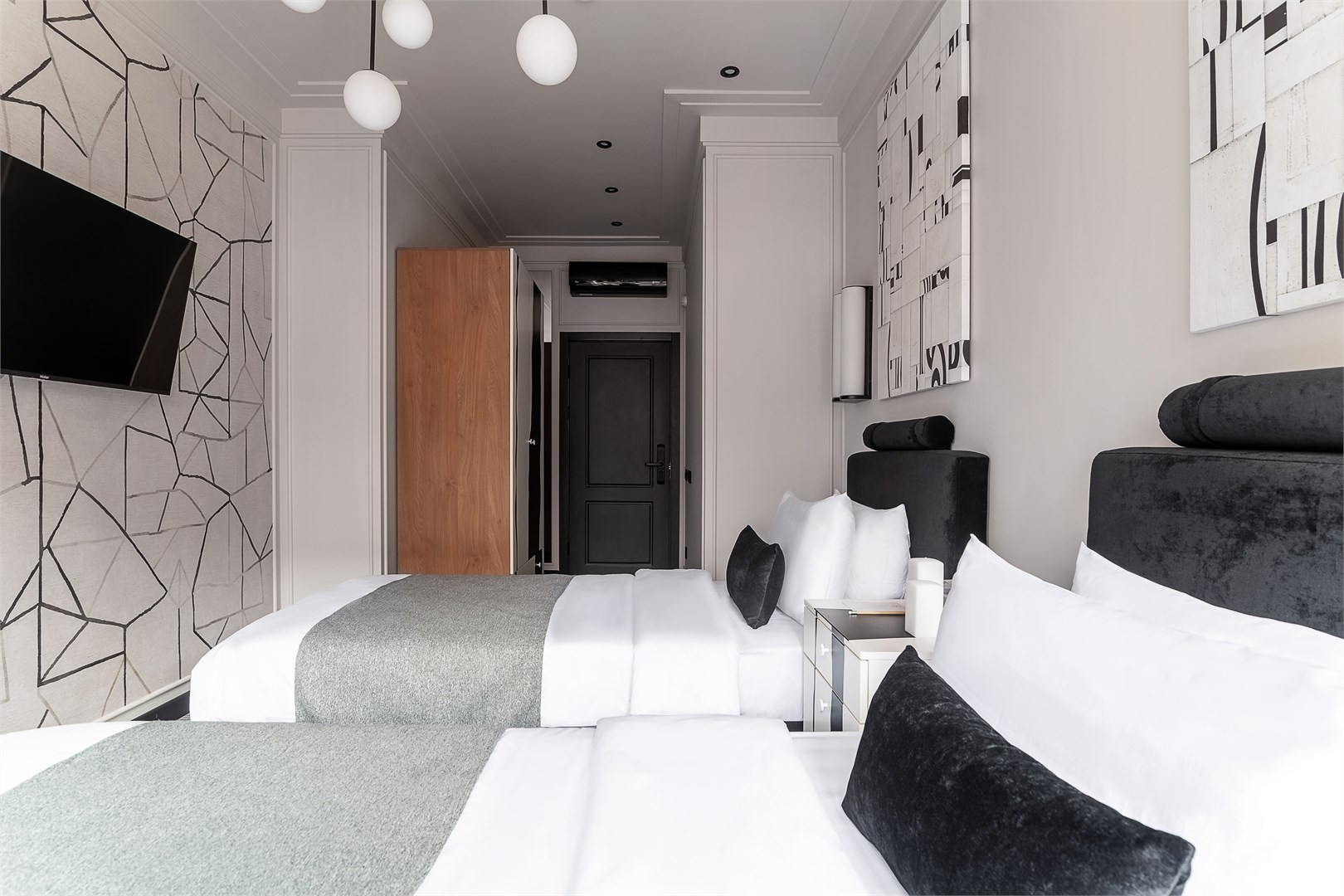 - Мебель: зеркало, кровати односпальные, прикроватные тумбочки, стол, стул, шкаф